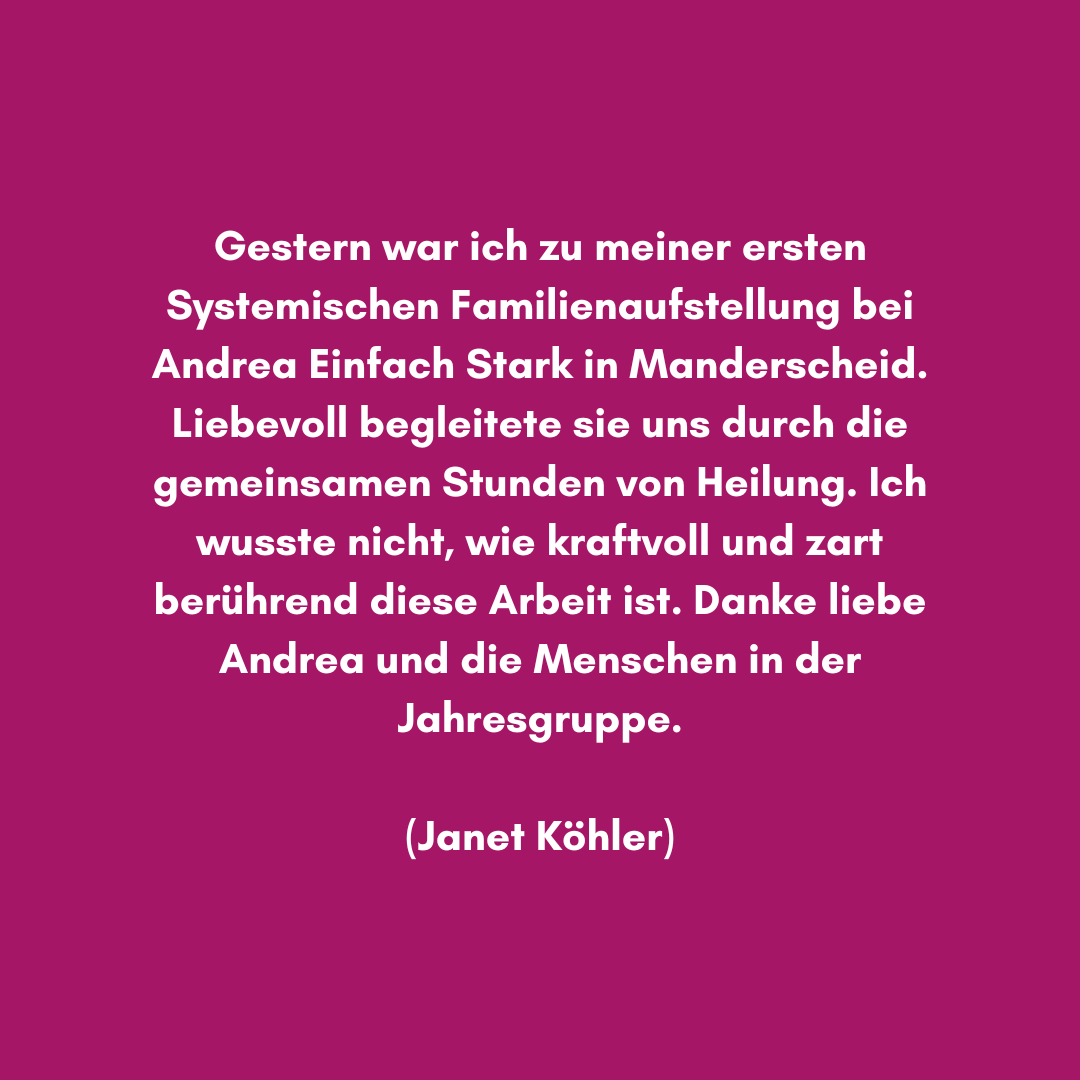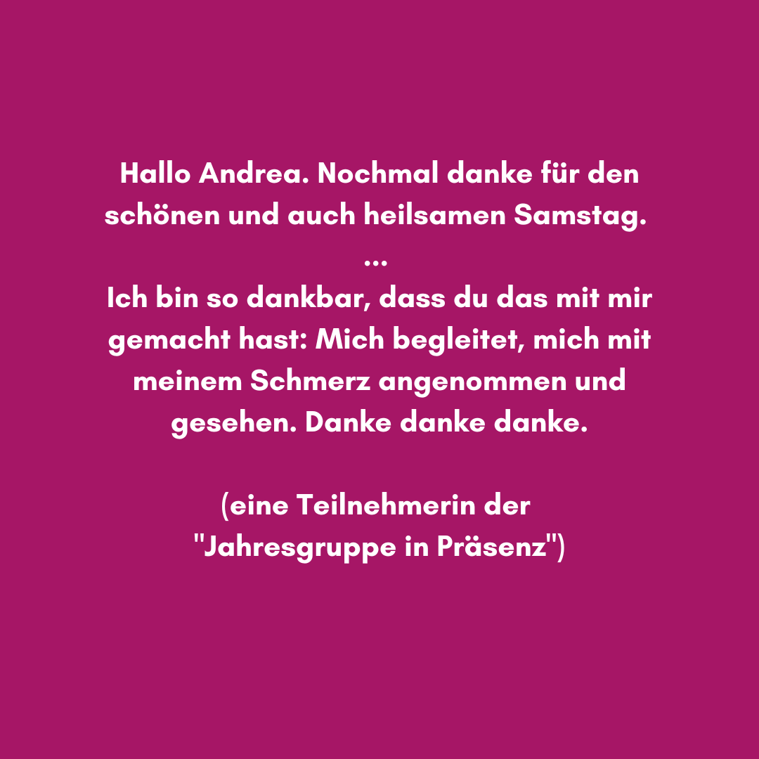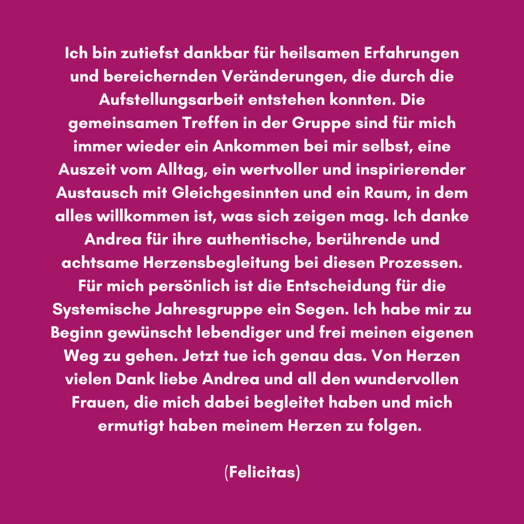 Und damit du das ganz in deinem eigenen Tempo tun kannst, biete ich ab März 2024 die nächste„Jahres-Gruppe in Präsenz“ an - mit Systemischen Aufstellungen und prozessbegleitenden Übungen. So kannst du in aller Ruhe, in einem geschützten Rahmen und mit einer festen Gruppe von Menschen deine Themen der Reihe nach klären. Du kannst dabei einen Heilungsprozess in Gang setzten und (wieder) zu mehr Lebensfreude, Leichtigkeit und Selbstbestimmtheit finden.